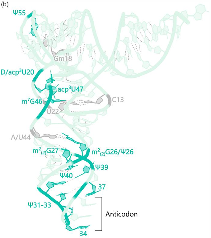 Three-dimensional structure of a tRNA molecule with highlighted positions of modified nucleotides.